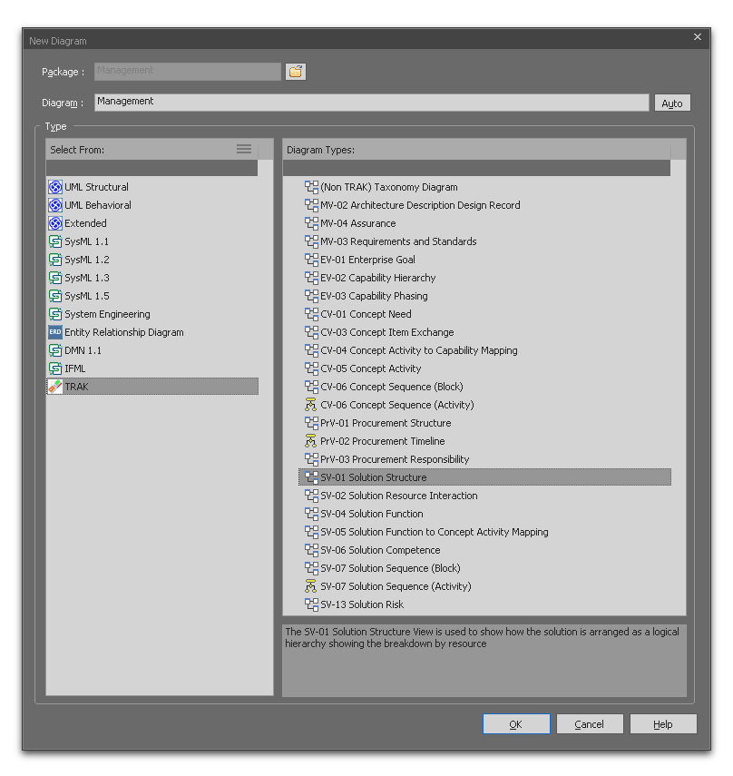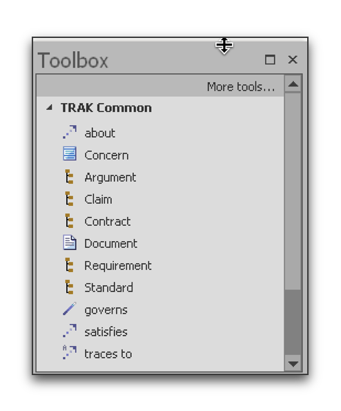 The MDG is an implementation of TRAK that provides a set of objects and connectors in palettes that correspond to the TRAK Viewpoints specification[2] (a specification for the content and purpose of each of the views). The aim of this was to make it easier for modellers/architects to produce models and architecture views describing systems and conform to the requirements ofTRAK.
